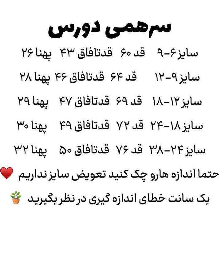 خوشرنگ ترین و قشنگترین سرهمیای دخترونه سایزبندی اسلاید آخر چک کنید سایزبندی از۶ماه تا۳۶ماه لطفا به اندازه ها دقت کنید و طبق اون سایز مورد نظرتونو انتخاب کنید جثه و سرعت رشد بچه ها با هم فرق داره مقایسه نکنید و با لباسی که سایز کوچولوی خودتونونه مطابقت بدید یک الی دو درجه تغییر رنگ به دلیل شرایط نور و عکاسی در نظر بگیرید 🌸